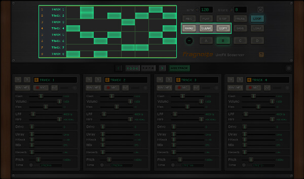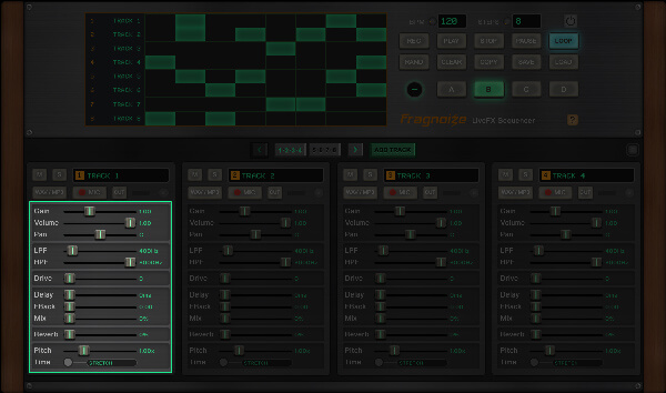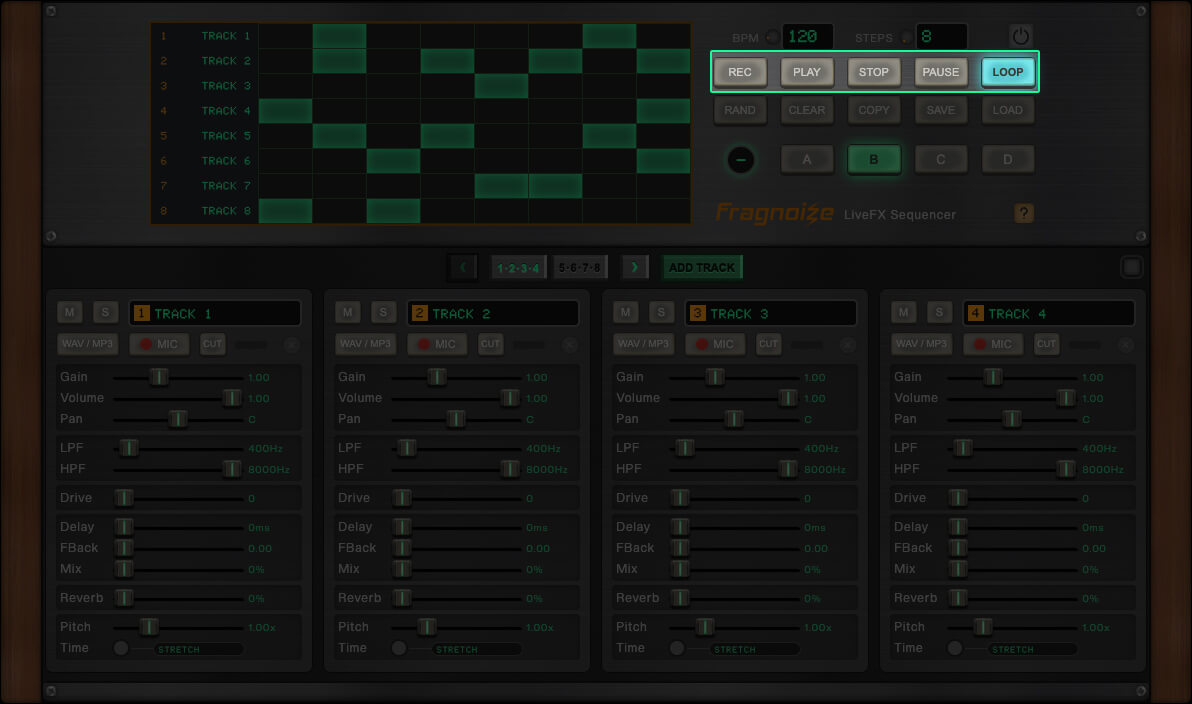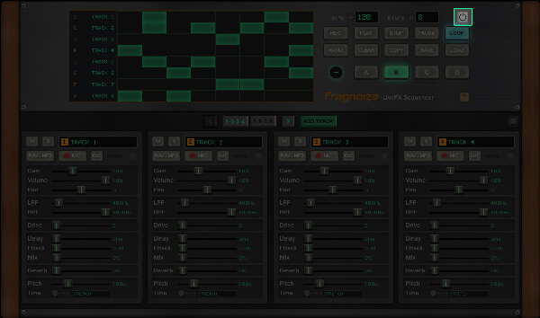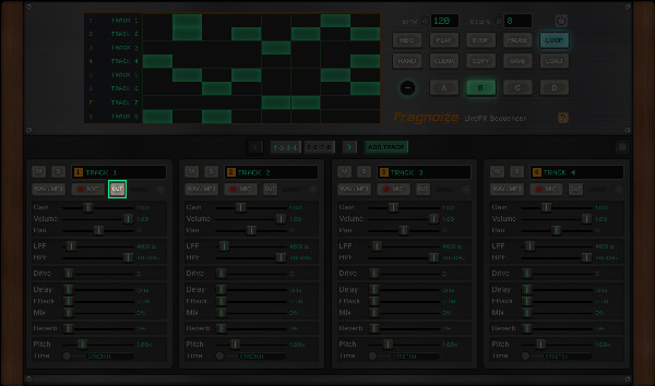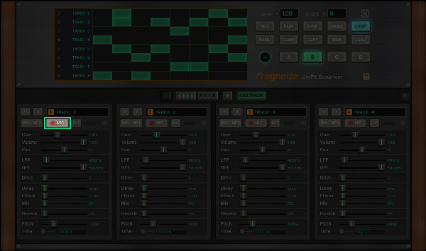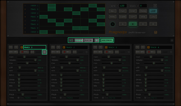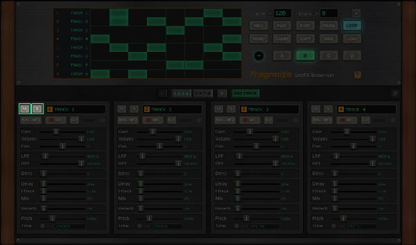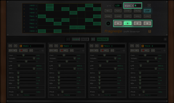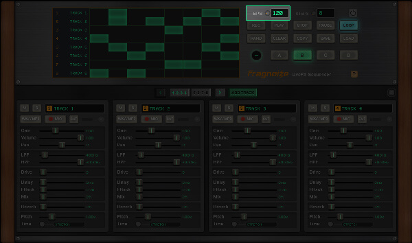 Use ADD TRACK to create new tracks, each with independent controls and its own sample slot. You can work with a minimum of 8 and up to 16 tracks per session.