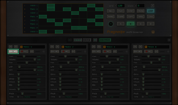To add a sound sample, drag and drop an audio file onto the WAV/MP3 button for that track, or click the button to load an audio file from your device.