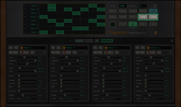 Export or import patterns with the SAVE and LOAD buttons. JSON files contain the grid state for all patterns, as well as each track’s effect parameters. Note: Audio samples are not included in saved pattern files - only note information and effect settings are stored.